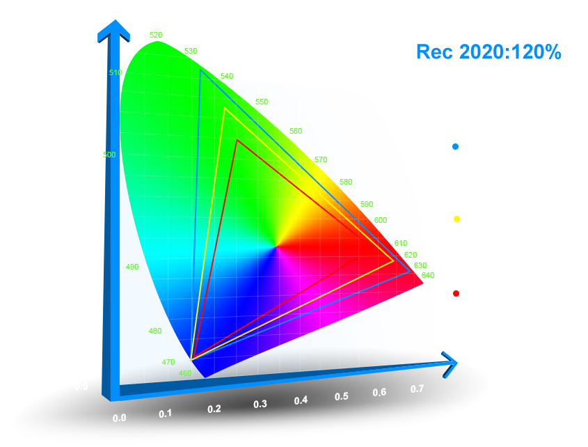 2、更大色域( 色域值达120% Rec.2020,165% DCI-P3,210% Rec.709)
